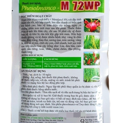 Phesolmanco-M 72WP chứa Mancozeb 64% + Metalaxyl 8% có công dụng trong việc phòng, điều t r ị các loại sâu bệnh hoặc các vấn đề cây trồng trong Nông nghiệp.