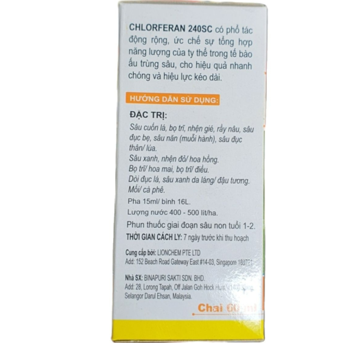 - CHLORFERAN 240SC có tính tiếp xúc, vị độc mạnh và thấm sâu tốt. Thuốc tác động làm ức chế sự tổng hợp năng lượng của ty thể trong tế bào ấu trùng miệng nhai và nhện. Cơ chế tác động mới này làm sâu hại chưa kịp thích nghi và biểu hiện tính kháng, do đó thuốc cho hiệu quả nhanh và kéo dài ngay cả trên những đối tượng sâu hại khó trị.