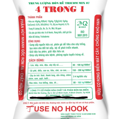 - Hữu cơ: 45g/kg, (Đạm): 12g/kg, P205(Lân): 5g/kg,