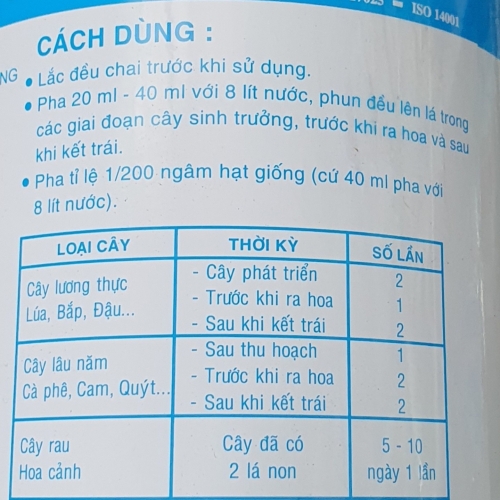 Pha 20 - 40ml pha với 8 lít nước, phun đều lên lá trong các giai đoạn sinh trưởng, trước khi ra hoa và sau khi kết trái