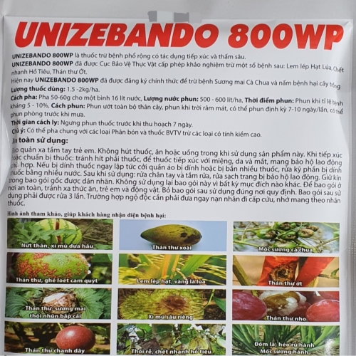 Unizebando 800WP SIÊU NẤM BỆNH chứa Mancozeb (min 85%) có công dụng trong việc phòng, điều t r ị các loại sâu bệnh hoặc các vấn đề cây trồng trong Nông nghiệp.