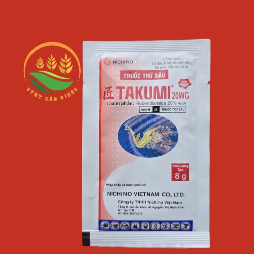 1. TAKUMI 20 WG: Là loại thuốc trừ sâu thế hệ mới được phát minh bởi hãng NIHON NOHYAKU NHẬT BẢN với hoạt chất Flubendiamide,thuốc có cơ chế diệt các loại sâu miệng nhai(bộ cánh vẩy) bằng cách làm co rút cơ sâu cách diệt sâu mới lạ này mà TAKUMI 20 WG diệt được các loại sâu khó tr-ị hay sâu đã kháng thuốc thuộc nhóm lân,cúc hay điều hòa sinh trưởng.